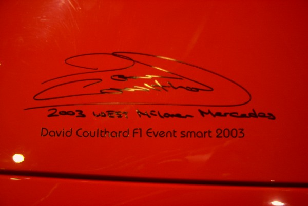 Autogramme auf der Fronthaube weisen am Fahrzeug auf den erfolgten Renneinsatz hin.